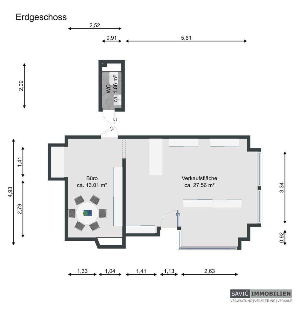 Die helle Verkaufsfläche bietet ca. 35,97 m², ergänzt durch ca. 14,12 m² Nebenräume inkl. Nasszelle – insgesamt stehen ca. 50,09 m² zur Verfügung.
