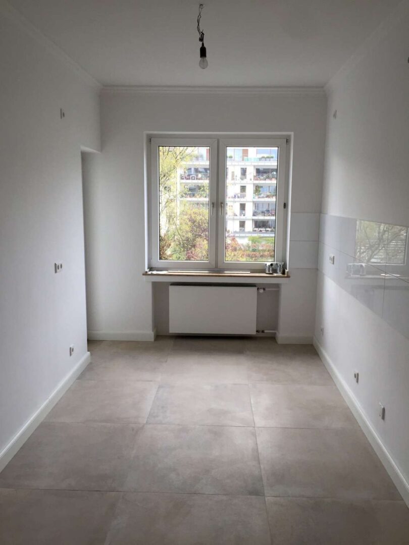 Die Küche, welche ebenfalls zum Balkon führt, ist mit einer großen matten Fliese im Bodenbereich, sowie eine Sockelleiste hoch Uni weiß und einer großen weißen Fliese im Wandbereich ausgestattet. Sämtliche Wand- und Deckenflächen sind glatt gespachtelt, sowie mit einer Stuckleiste im Deckenbereich versehen.