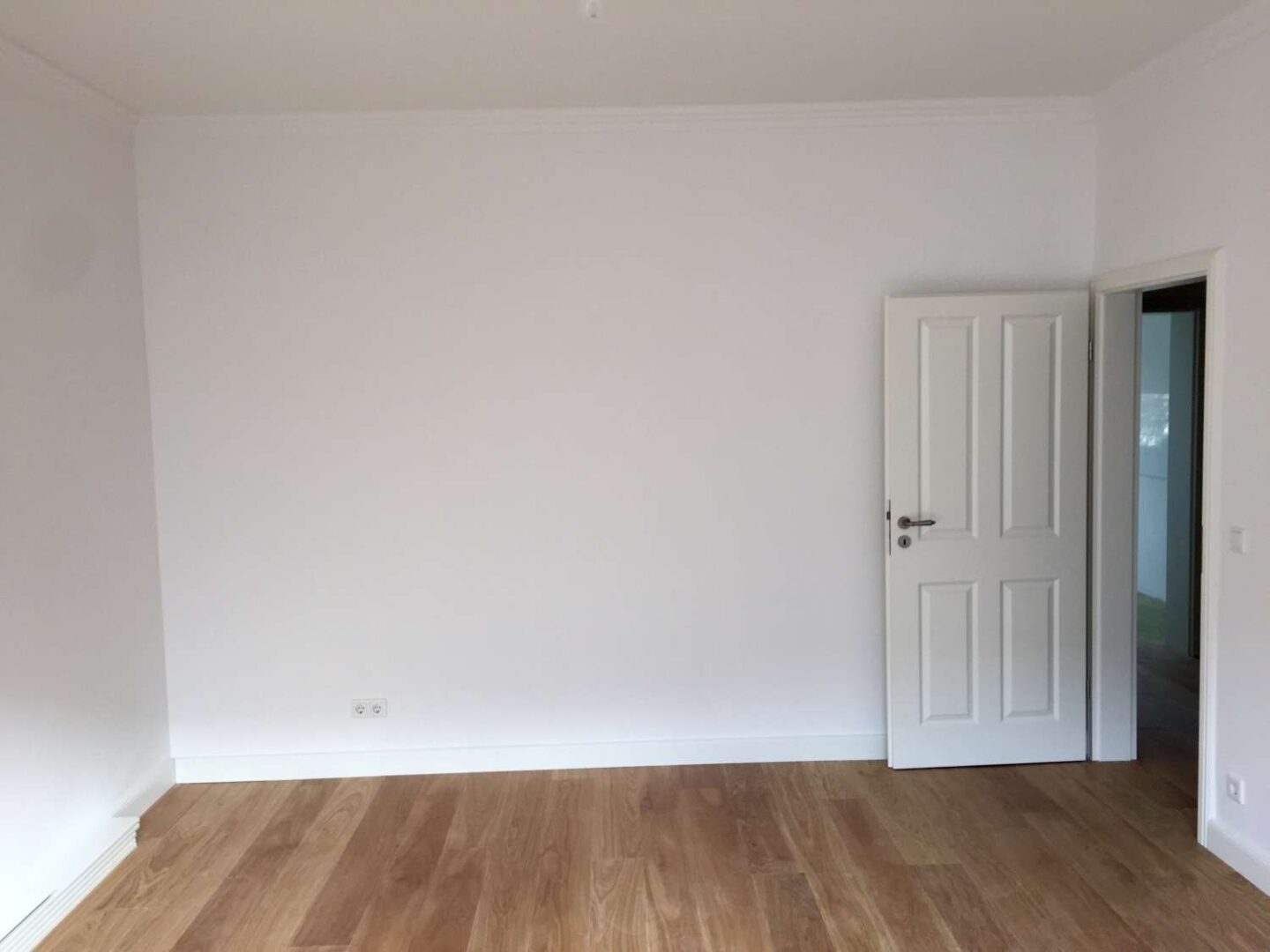 Angrenzend befindet sich das Schlafzimmer, welches sich nach hinten zum Garten gelegen befindet. Die Fenster in diesem Raum sind ebenfalls isolierverglast. Sämtliche Wand- und Deckenflächen sind glatt gespachtelt, sowie mit einer Stuckleiste im Deckenbereich versehen. Den Bodenbelag stellt eine Landhausdiele Eiche gebürstet Mattlack, sowie eine Sockelleiste hoch Uni weiß matt dar.