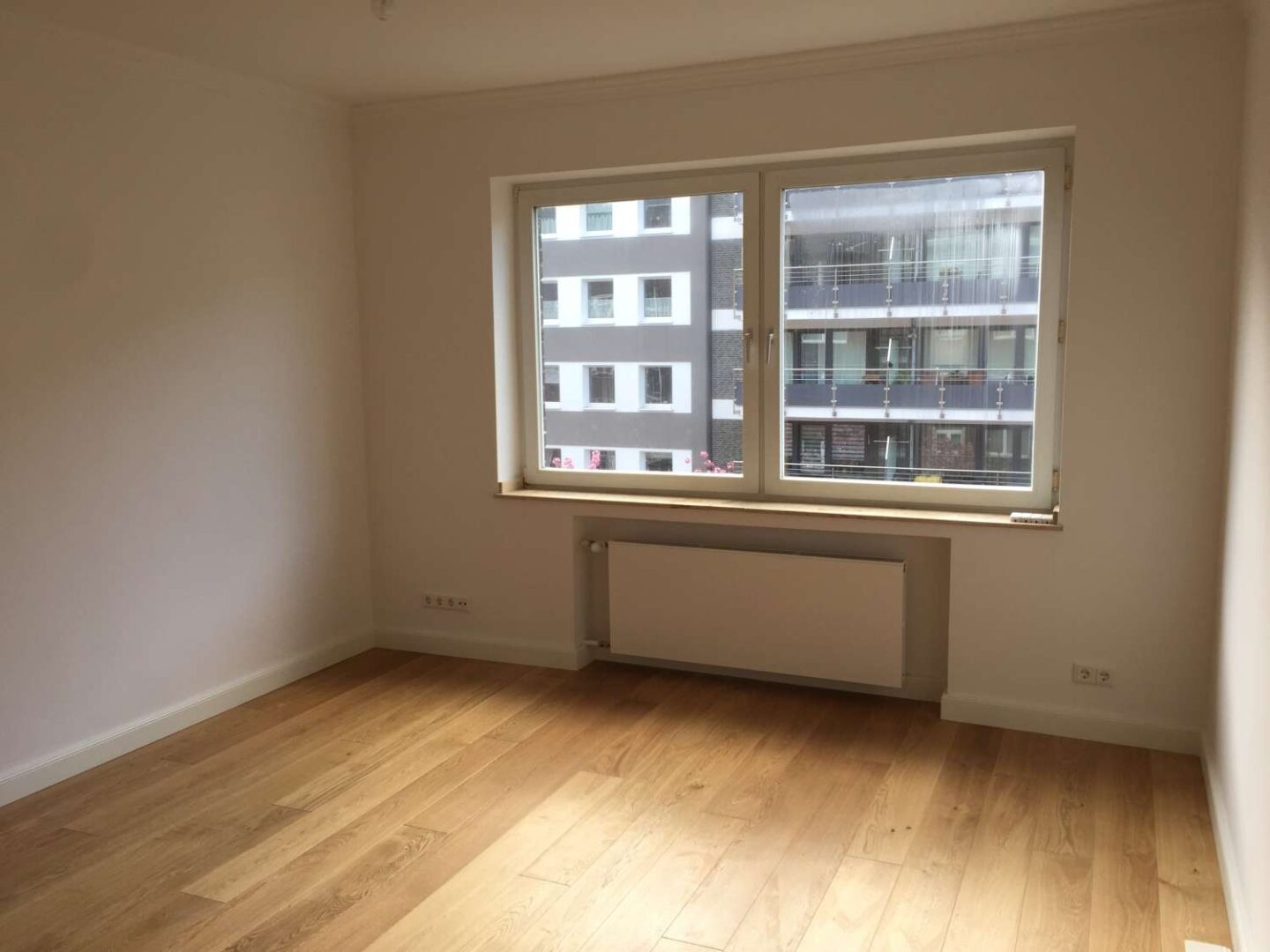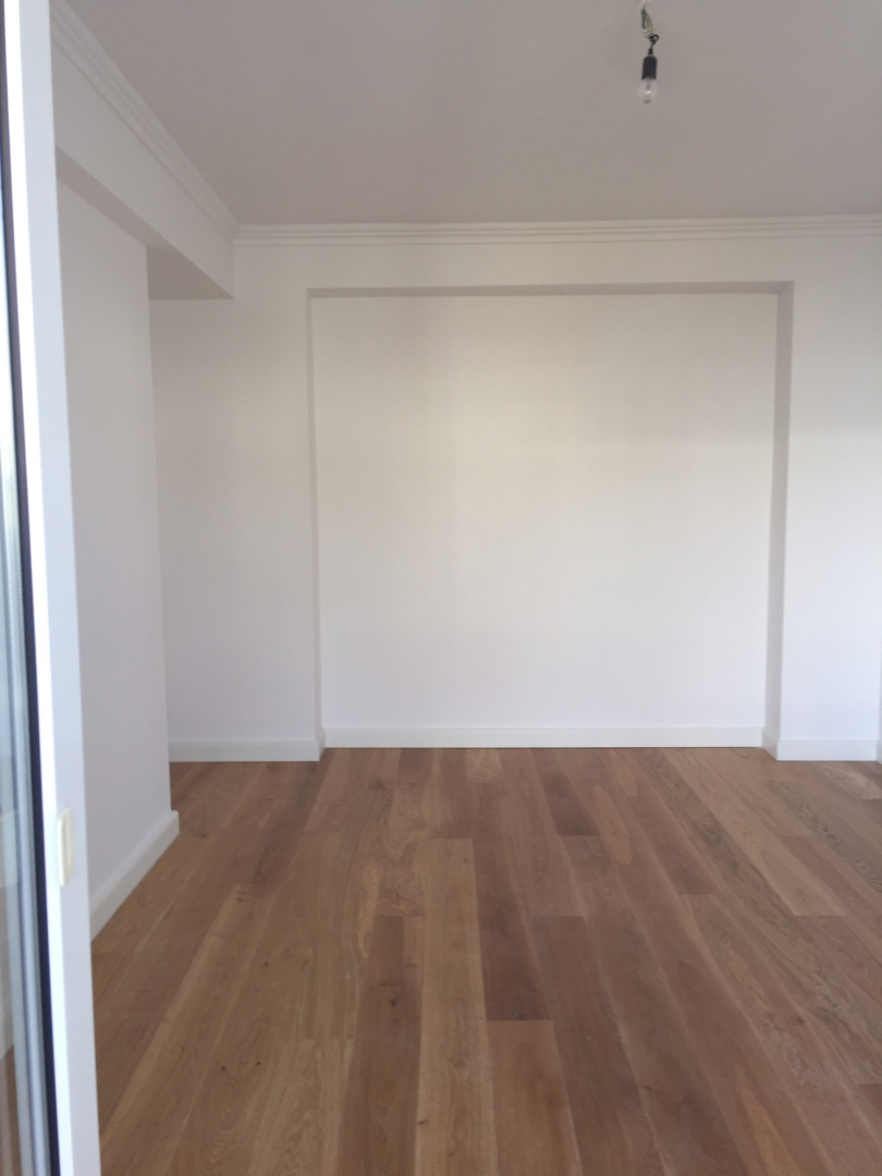 Über einen repräsentativen Hauseingangsbereich erreichen Sie die Wohnung im 3. Obergeschoss des Hauses gelegen, über einen kleinen Flur, welcher Sie unteranderem in das geräumige Wohn- und Esszimmer, das den Mittelpunkt der Wohnung darstellt, führt. Die Fenster in diesem Raum sind isolierverglast. Sämtliche Wand- und Deckenflächen sind glatt gespachtelt, sowie mit einer Stuckleiste im Deckenbereich versehen. Den Bodenbelag stellt eine Landhausdiele Eiche gebürstet Mattlack, sowie eine Sockelleiste hoch Uni weiß matt dar.