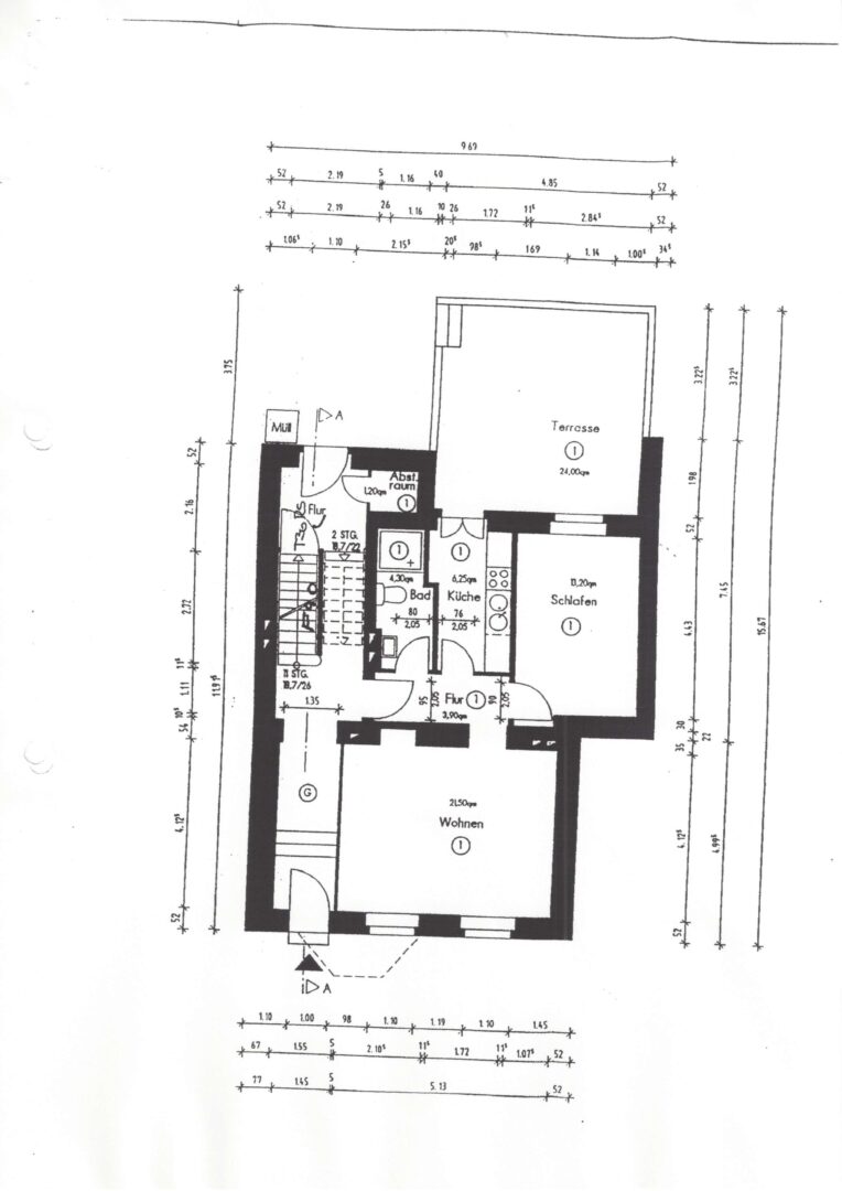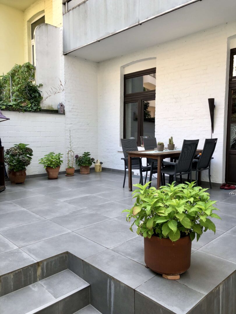 Die Küche, welche ebenfalls zur Terrasse führt, ist mit einer Feinstein-Fliese im Bodenbereich und einer grossen weißen Fliese im Wandbereich ausgestattet. Sämtliche Wandflächen sind mit einer Raufasertapete versehen.