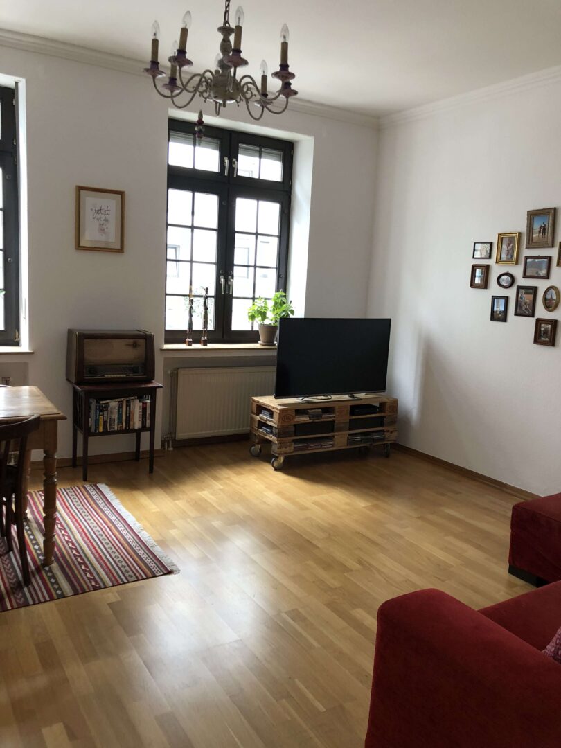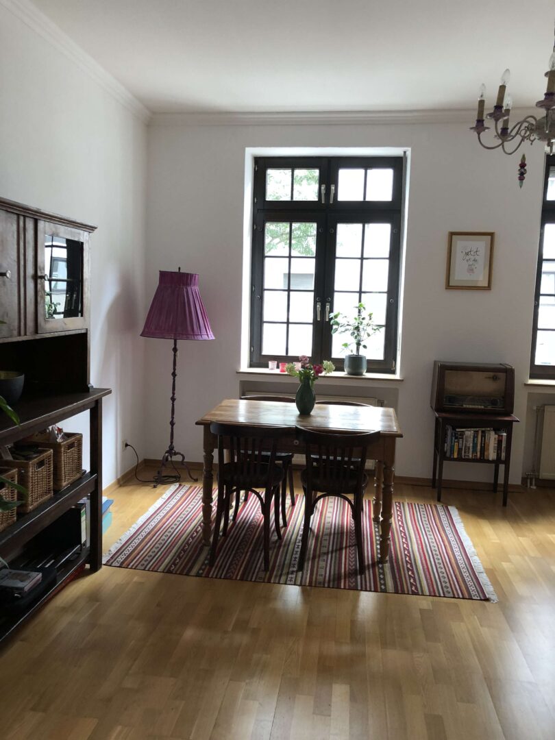 Die hier beschriebene Wohnung befindet sich in einem charmanten vier Parteien Stadthaus im Stadtteil Grafenberg. Über einen repräsentativen Hauseingangsbereich erreichen Sie die Wohnung im Erdgeschoss des Hauses gelegen, mit einem kleinen Flur welcher Sie unteranderem in das geräumige Wohn- und Esszimmer, das den Mittelpunkt der Wohnung darstellt, führt. Die Fenster in diesem Raum sind isolierverglast, als auch mit Rollläden ausgestattet. Sämtliche Wandflächen sind mit einer Raufasertapete versehen. Den Bodenbelag stellt ein Echtholz-Parkettboden dar.