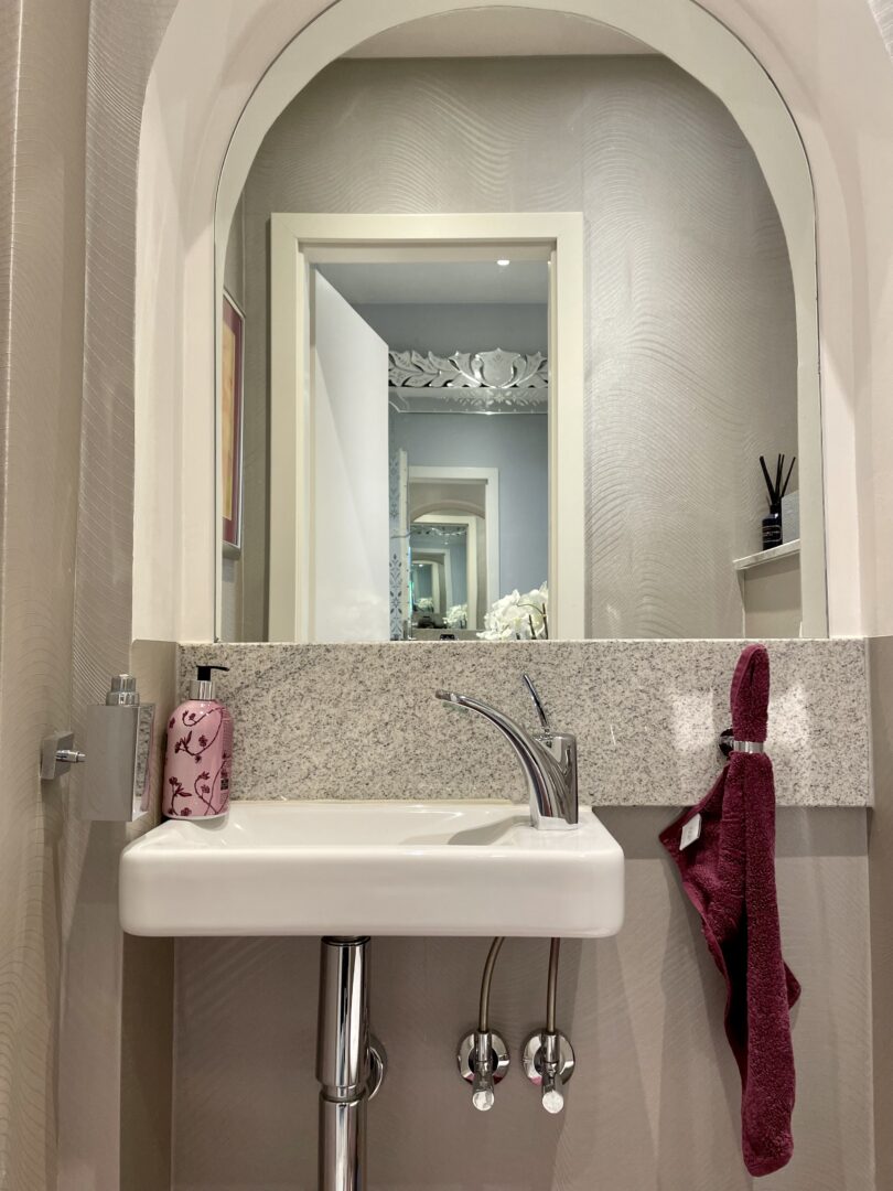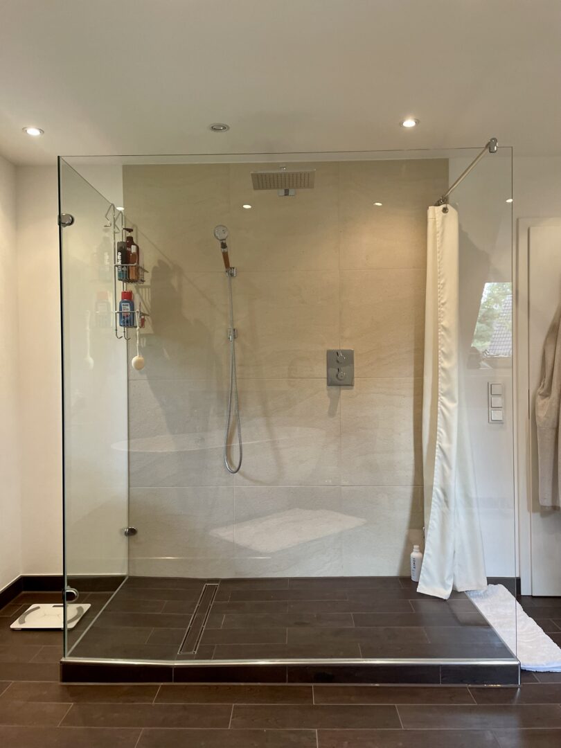 - Luxuriöses Bad … Holz-Fliese … großer Mineralgusswanne (Burg) … Duravit-Schränken … Unterputz Lichtspiegelschrank … Dusche (180 x 90 cm) … Regendusche, Fenster