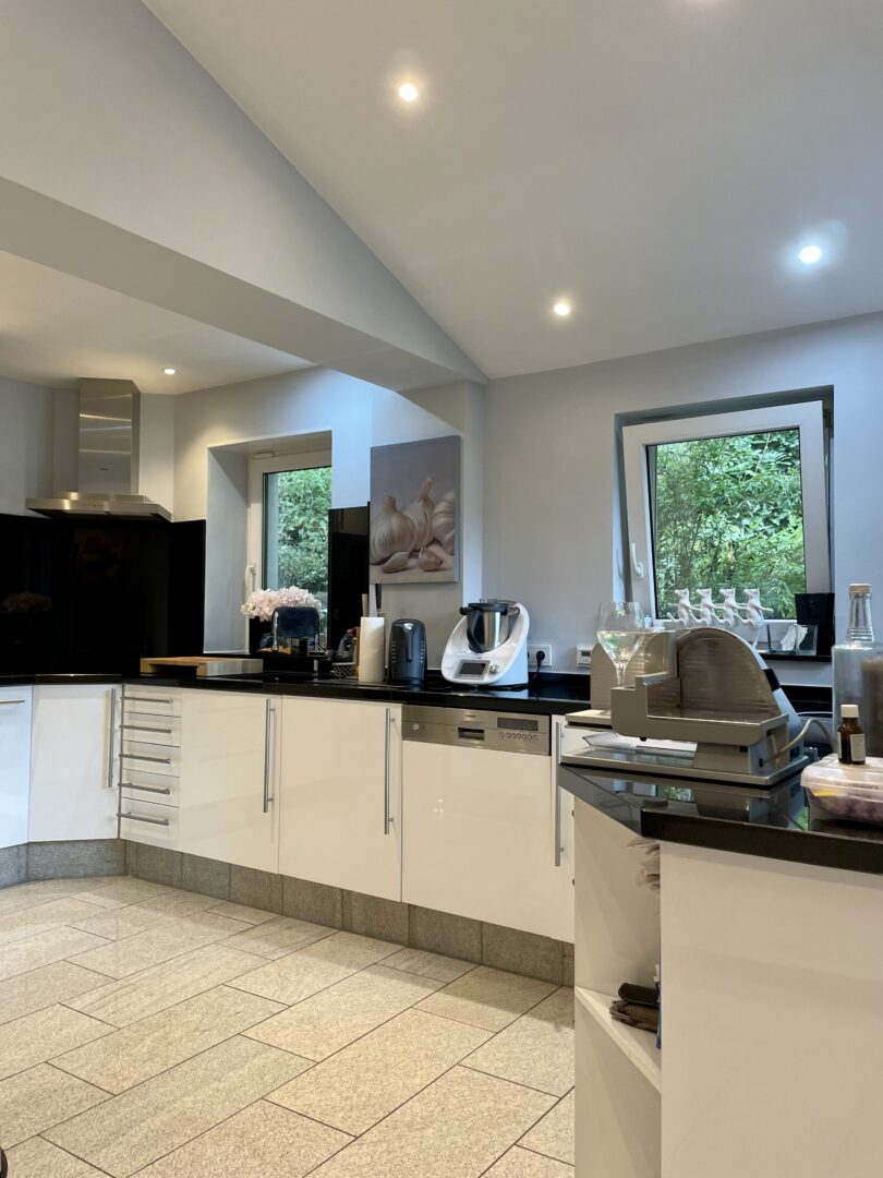 - Küche ... geräumig … Granitbodenfliesen … Weiße Einbauküche … Granitarbeitsplatte … Backofen … Herd mit Induktionsfeld … Spülmaschine … Mikrowelle … Side by Side Kühlschrank