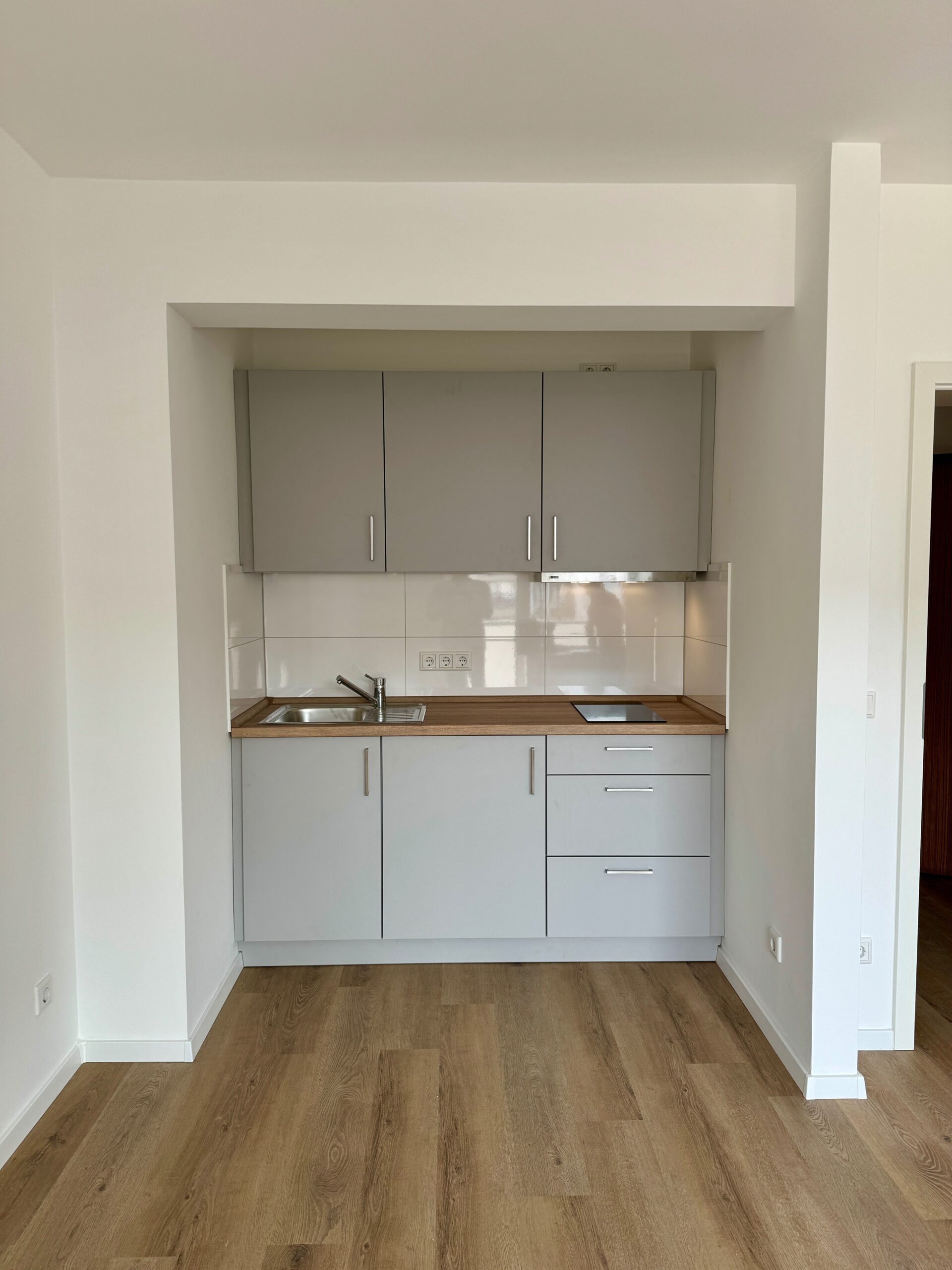 • Moderne Single-Küche mit Ceranfeld, integrierter Dunstabzugshaube und Unterbaukühlschrank mit Eisfach