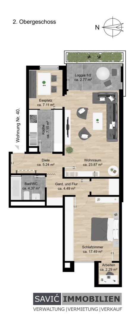 Der Wohnbereich mit Essplatz lädt zu entspannten Stunden ein und ist der perfekte Ort für gemütliche Abende. Das Schlafzimmer mit hochwertigem Riemchen-Parkett und der zusätzliche Arbeitsraum bieten Komfort und Flexibilität – ideal für Homeoffice oder Hobby.