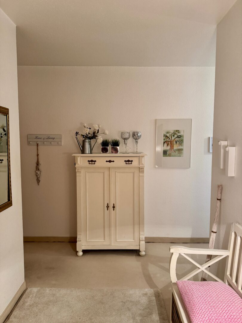 Die Wände und Decken sind mit Raufasertapete oder einer strukturierten Oberfläche versehen und weiß gestrichen. In der Küche setzen beigebraune Wandfliesen im unteren Bereich einen harmonischen Kontrast zu den hellen Wandfarben. Die Türen sind in Echtholz mit Kirschbaumfurnier gehalten, während die Türrahmen champagnerfarben gestrichen wurden.