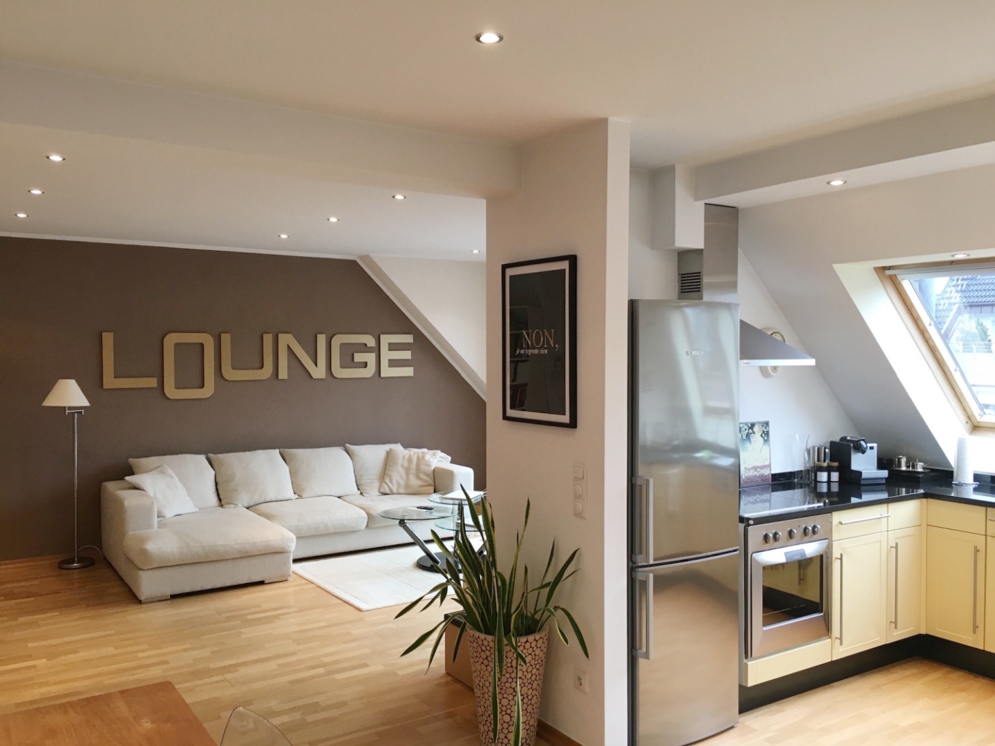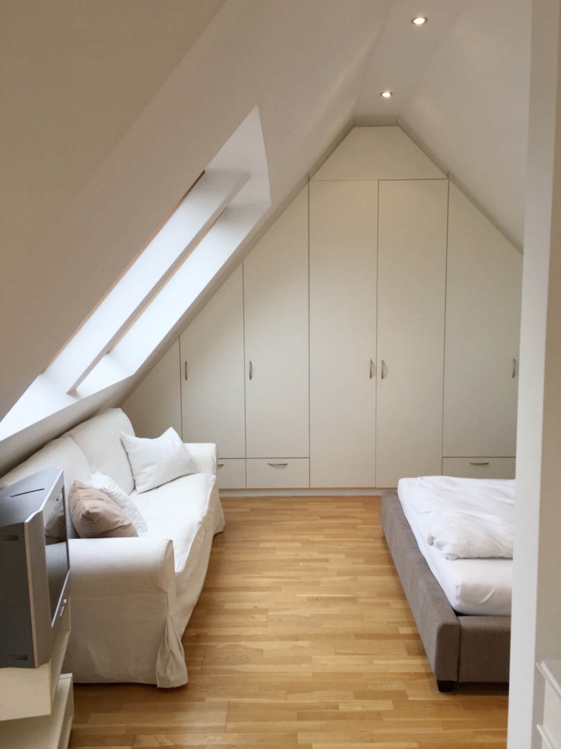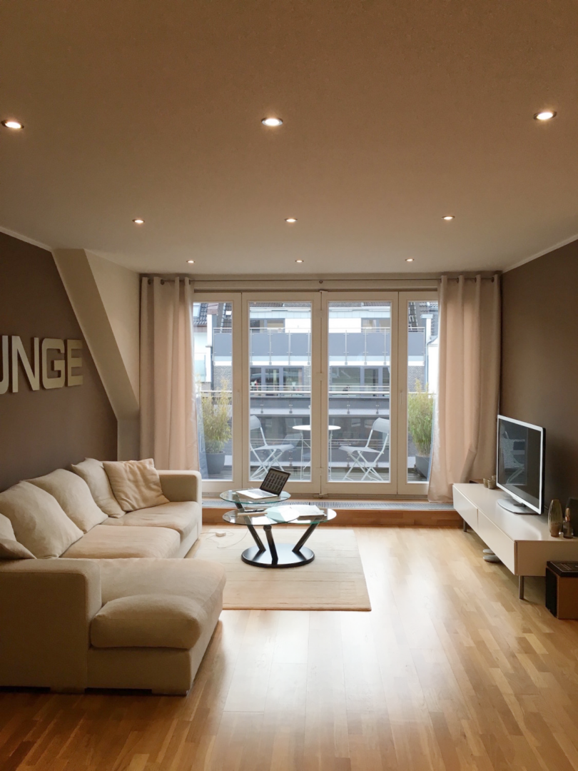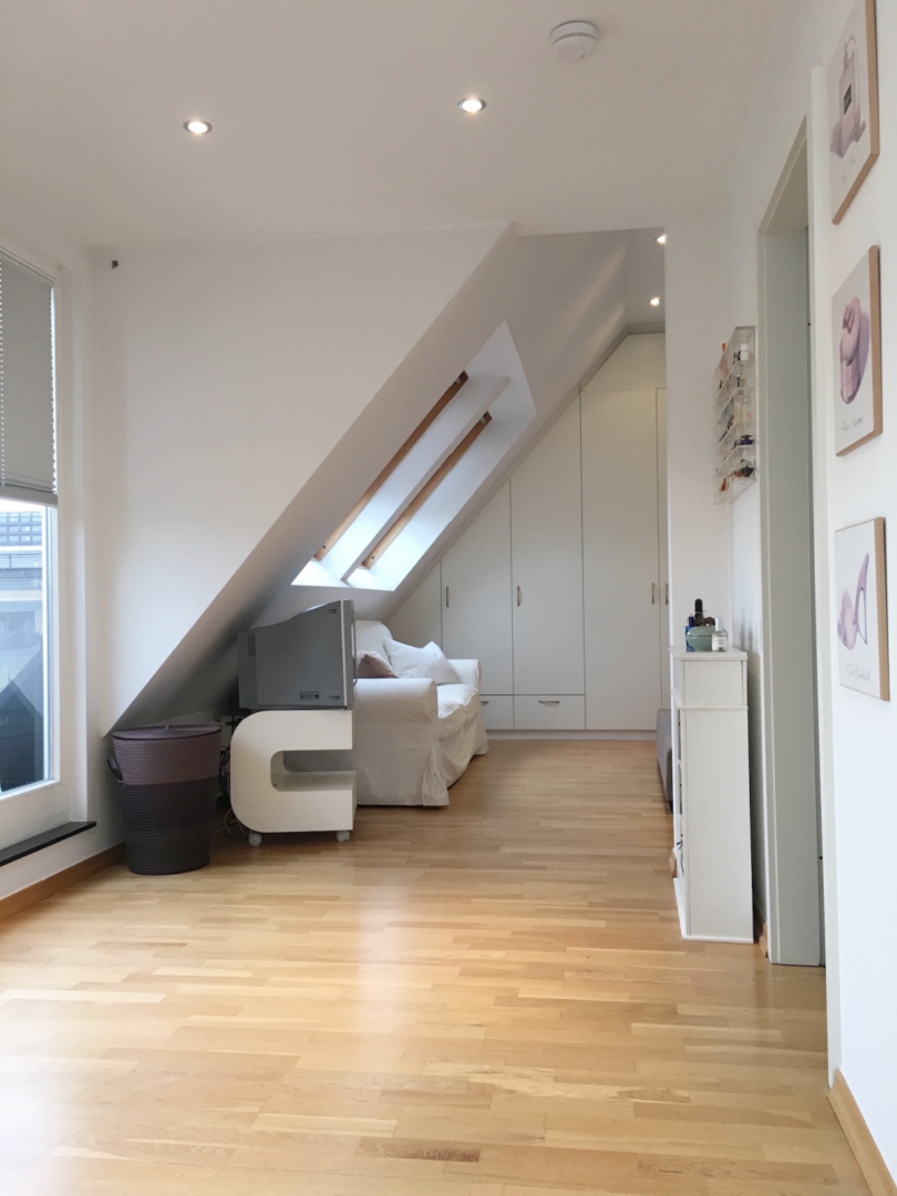 Die hier offerierte Maisonette-Wohnung liegt im 5. Stock eines Mehrparteienhauses, welche über das großzügige Treppenhaus erreichbar ist. Sie betreten die Wohnung und gelangen über die Diele in den offenen Wohn-/Essbereich mit angrenzender Dachterrasse. Eine Fensterfront mit Schiebeelementen garantiert eine Lichtdurchflutung des Raumes. Auf gleicher Ebene präsentiert sich Ihnen eine offene Küche, die samt aller elektronischen Geräte im Mietpreis enthalten ist. Ein Gäste-Duschbad, sowie ein weiteres Zimmer, welches sich optional als Büro oder Gästezimmer anbietet, komplettieren das Angebot auf dieser Ebene. Über die interne Wendeltreppe erreichen Sie den Schlafbereich mit hochwertigen Einbauschränken und einem ebenso hochwertigen Bad mit Badewanne. Das Highlight der Wohnung sind die beiden Dachterrassen auf den jeweiligen Ebenen. Im Sommer und an schönen Tagen genießen Sie hier im Freien den Vorzug klassischen Penthouse-Flairs. Alle Wände im Wohnraum sind glatt geputzt und in weiß gestrichen, die Böden mit Parkettboden verlegt. Ein Kellerraum gehört ebenfalls dazu. Eine Garage am Haus selbst, kann mit angemietet werden. Ein Wohntraum für anspruchsvolle Singles und Individualisten!