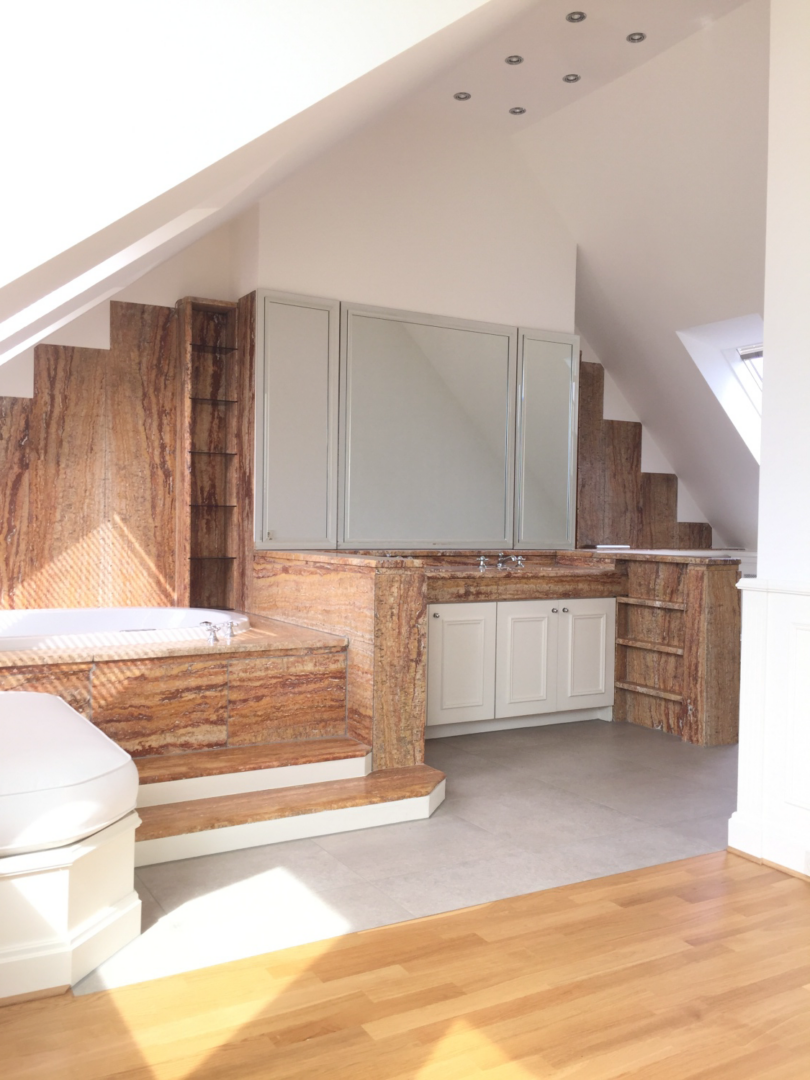 Die hier offerierte Penthouse-Maisonette-Wohnung liegt im 6. Stock eines Mehrparteienhauses. Dieser lässt sich bequem mit einem Fahrstuhl erreichen. Zur Auswahl steht das Treppenhaus. Sie betreten die Wohnung und gelangen über die Diele in den offenen Wohn-/Essbereich mit angrenzender Dachterrasse. Eine Fensterfront mit Schiebeelementen garantiert eine lichtdurchflutung des Raumes. Auf gleicher Ebene präsentiert sich Ihnen eine offene Kochnische, die samt aller elektronischen Geräte in Mietpreis enthalten ist. Gaggenau und Neff Einbaugeräte sprechen an dieser Stelle für sich. Ein Gäste-Duschbad, sowie ein weiteres Zimmer, welches sich optional als Büro oder Gästezimmer anbietet, komplettieren das Angebot auf dieser Ebene. Über die interne Wendeltreppe erreichen Sie den Schlafbereich mit hochwertigen Einbauschränken und einem offenen luxuriösen Bad mit Jacuzzi. Das außergewöhnliche Bad en suite präsentiert sich in feinstem Marmor. Zwei Waschtische, ein WC, sowie ein Bidet und ein gepolsterter Sitzbereich neben der Badewanne kombinieren Luxus mit Praktikabilität. Das Highlight der Wohnung sind zwei große Dachterrassen, die man von jedem Raum der unteren Ebene betreten kann. Im Sommer und an schönen Tagen genießen Sie hier im Freien den Vorzug klassischen Penthouse-Flairs. Alle Wände im Wohnraum sind glatt geputzt und in weiß gestrichen, die Böden mit Parkettboden verlegt. Ein Kellerraum gehört ebenfalls dazu. Ein Tiefgaragenstellplatz in der hauseigenen Tiefgarage kann hinzu gemietet werden. Ein Wohntraum für anspruchsvolle Singles und Individualisten!
