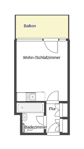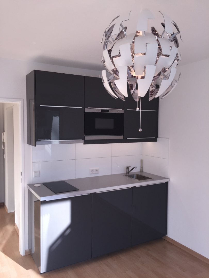 Das hier beschriebene Apartment befindet sich in einem gepflegten Mehrparteienhaus im Stadtteil Golzheim. Sie erreichen die Wohnung im 1. Obergeschoss Mitte des Hauses zum Garten gelegen, bequem über einen Aufzug. Ausgehend von der Diele, die über einen 4türigen Einbauschrank verfügt, gelangen Sie in den Wohn-/Schlafbereich. Darin befindet sich eine Einbauküche die über einen Kühlschrank mit Gefrierteil, einem zwei Platten-Ceran-Kochfeld, einer Dunstabzugshaube, einer Mikrowelle, einer Beleuchtung unterhalb der Hängeschränke, sowie über diversen Ober- und Unterschränke verfügt. Hier schließt sich ein modernes Badezimmer an, welches mit einer Badewanne ausgestattet ist.