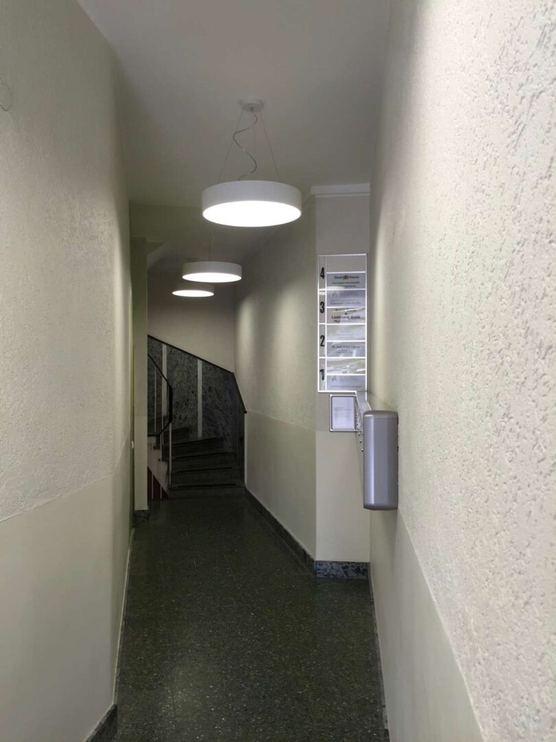 Das Objekt betritt man durch einen Eingang von der Hymgasse über das zentrale Treppenhaus oder den darin eingebauten neuen Aufzug.