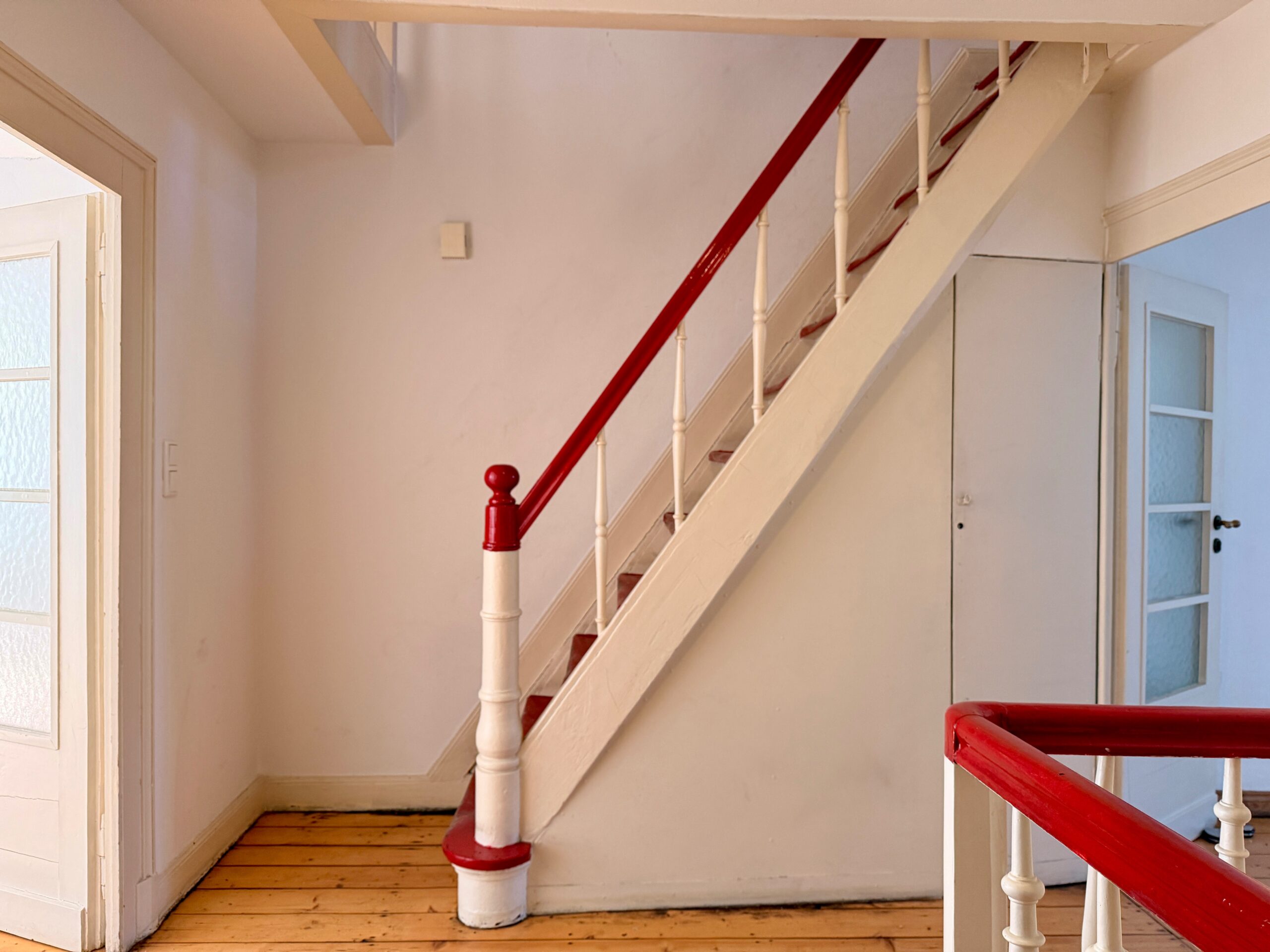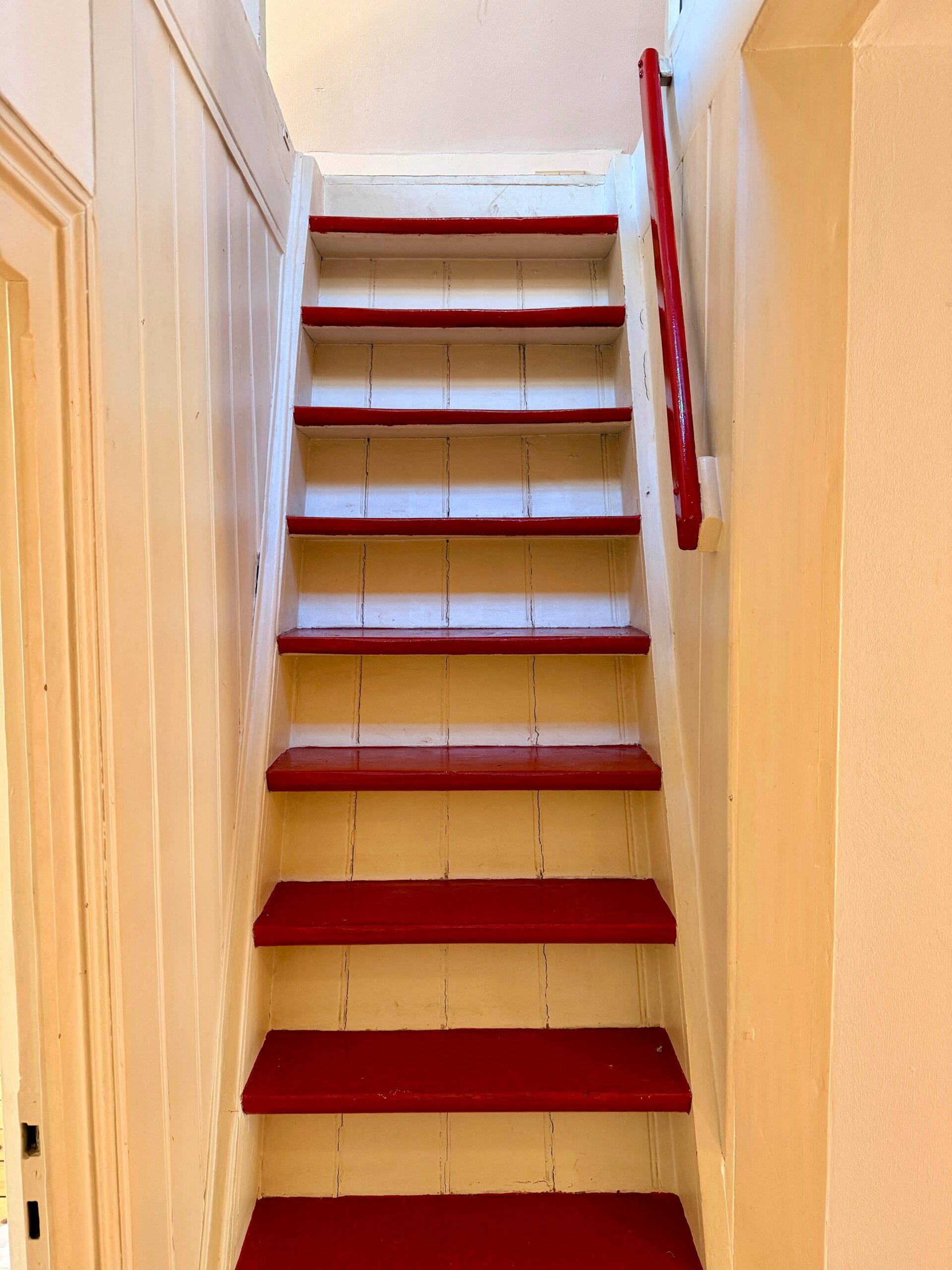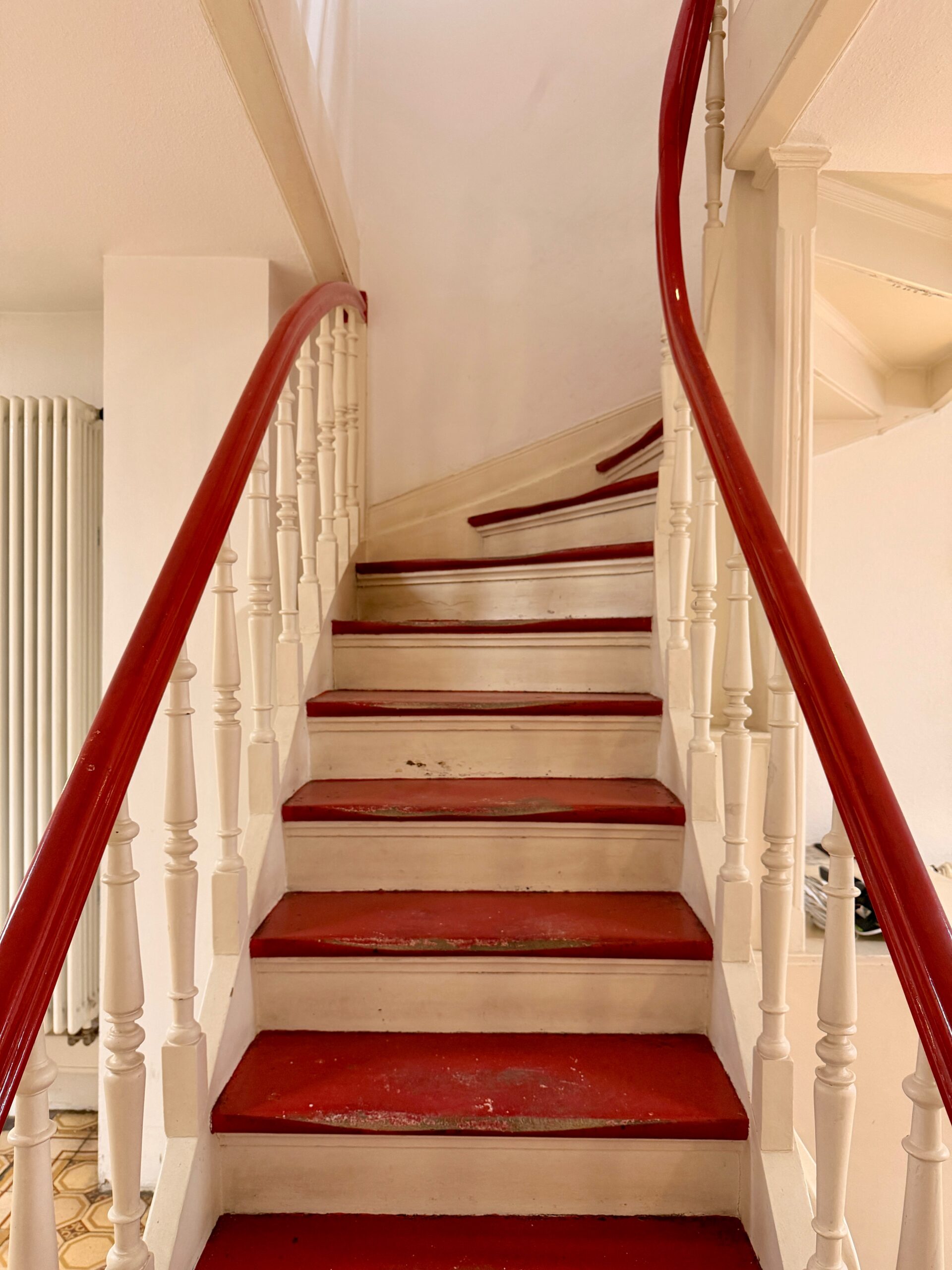 • Treppenhaus mit rot lackierten Stufen und hell gestrichenem Geländer